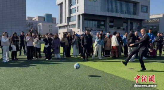 19日下午,在南京参加“2025世界市长对话·南京”活动的世界各城市的市长们走进南京市雨花台中学足球场,与学生守门员“过招”,感受“点球大战”的激情。“足球是世界通用语言”,多位市长在接受中新网记者采访时说。