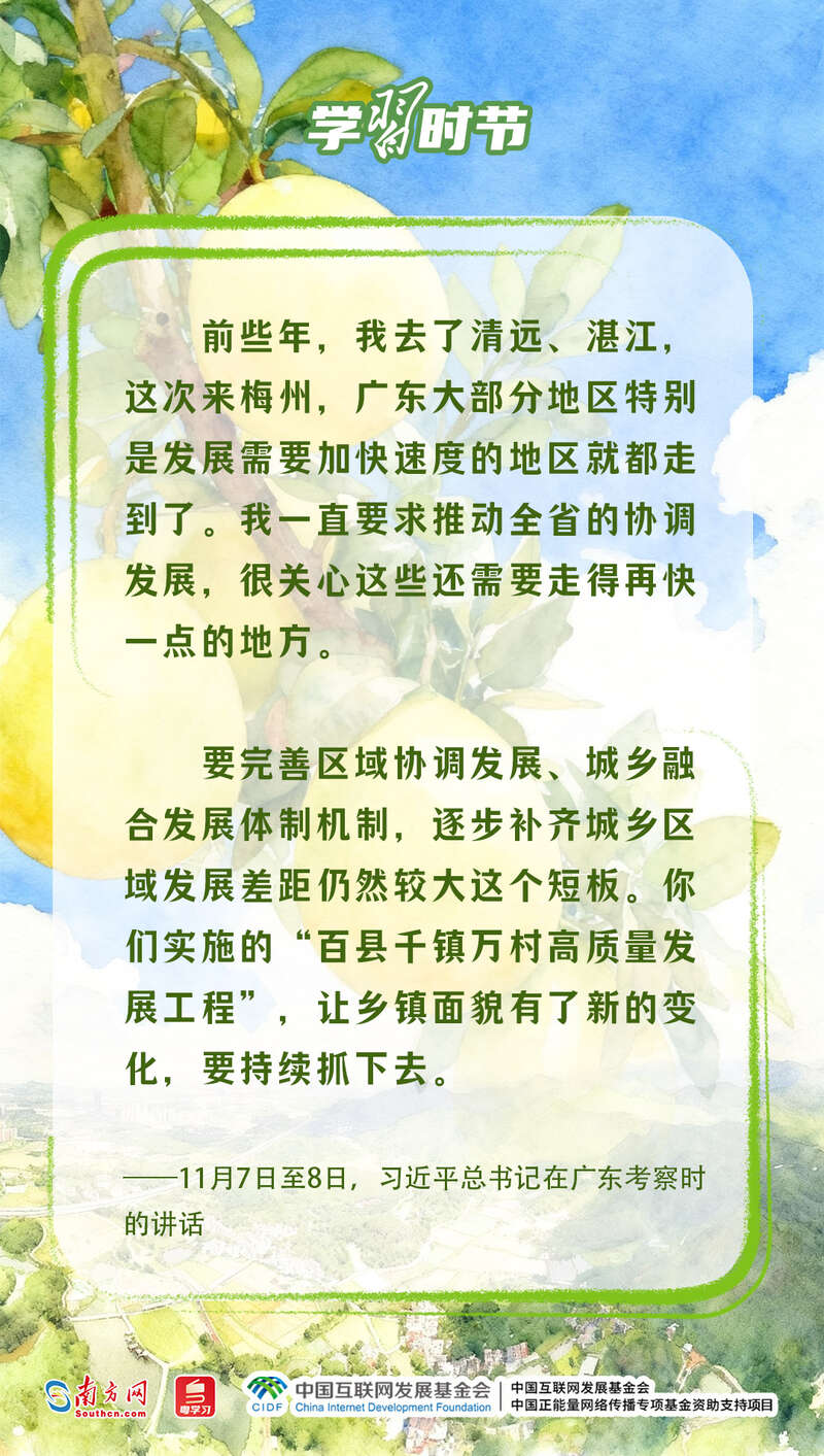 习近平总书记深切关注广东城乡区域协调发展。前不久,习近平总书记再次来到广东考察,充分肯定了“百县千镇万村高质量发展工程“(以下简称“百千万工程”),并叮嘱广东要完善区域协调发展、城乡融合发展体制机制,逐步补齐城乡区域发展差距仍然较大这个短板。
