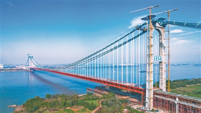 据介绍,燕矶长江大桥横跨湖北鄂州黄冈两地,采用一跨过江方式,是世界最大跨径四主缆悬索桥。因上受花湖机场航空限高影响,下要满足长江通航需要,燕矶长江大桥主塔高度仅184米,垂跨比也达到千米级悬索桥中前所未有的1∶15。