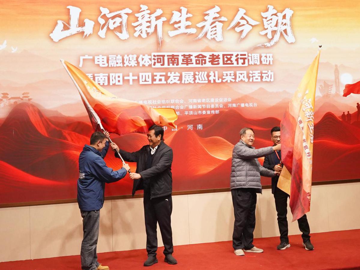 随后,河南省老区建设促进会副会长、河南省人大常委会原副主任赵建才和中广联合会广播新闻节目委员会会长杜嗣琨向调研团授旗。
