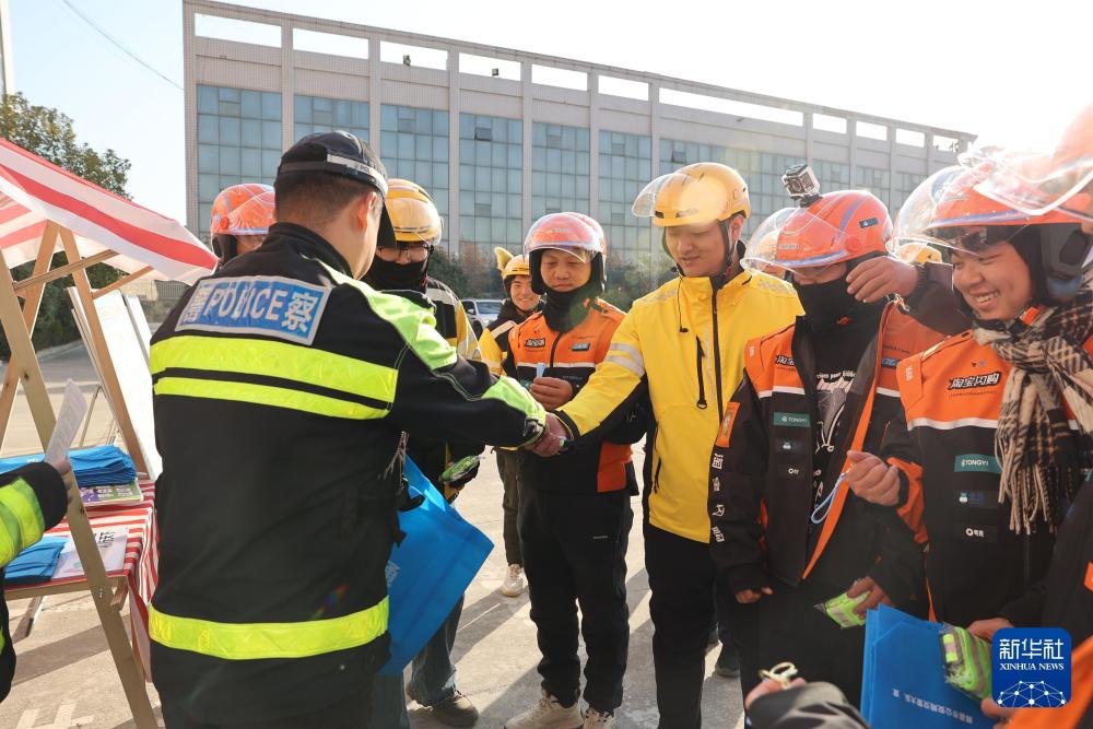 12月2日,新乡市辉县市举行“全国交通安全日”主题活动,交警正在现场向外卖配送员讲解交通安全知识。魏冬浩 摄