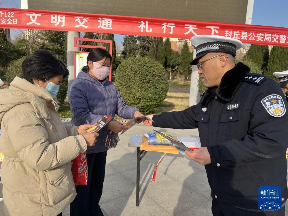 12月2日,新乡市封丘县开展“全国交通安全日”宣传活动,交警正在向群众发放宣传资料并讲解安全出行知识。靳润婷 摄