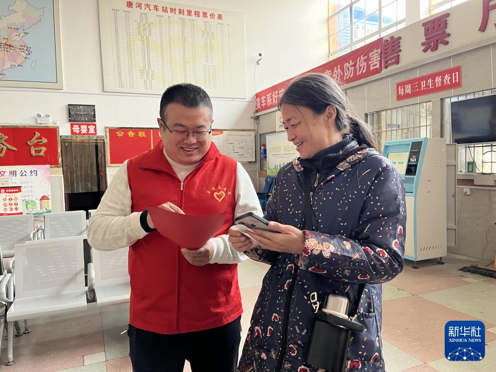 12月1日,在南阳市唐河汽车站候车室,交通志愿者向旅客发放交通安全宣传单、讲解安全出行知识。张旭 摄