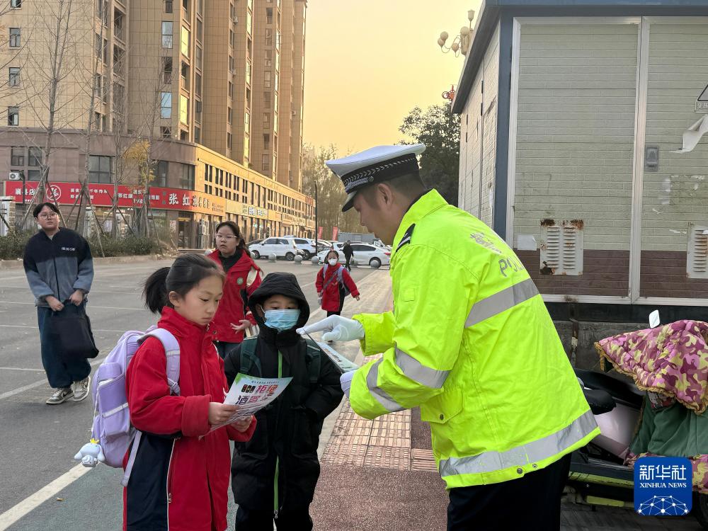 12月1日,在许昌市襄城县,交警正在向学生发放宣传资料并讲解交通安全知识。刘璐 摄