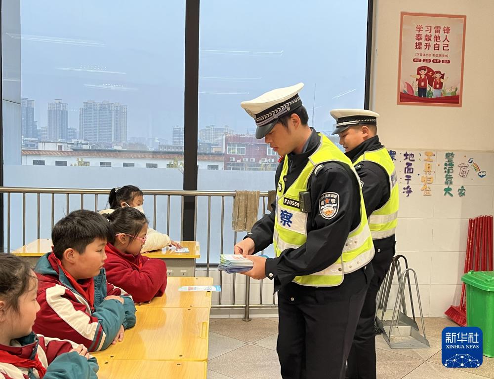 12月1日,在南阳市唐河县第六小学,交警向学生发放交通安全手册。王哲 摄