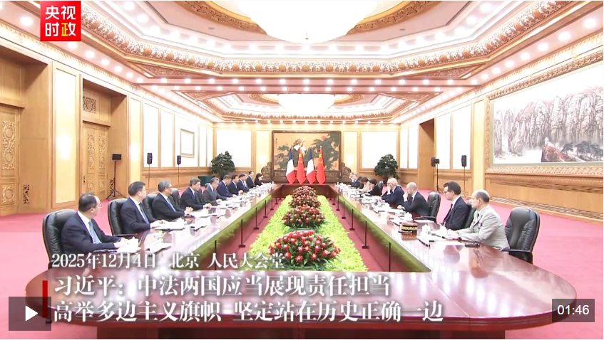 习近平主席在4日的会谈中提出殷殷期许:当前,百年变局加速演进,人类又一次站在何去何从的十字路口。中法两国应当展现责任担当,高举多边主义旗帜,坚定站在历史正确一边。