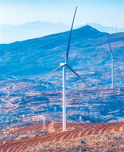 12月15日,河南省洛阳市嵩县九皋镇风电场,一排排风力发电机组迎风转动。 张怡熙摄(人民视觉)