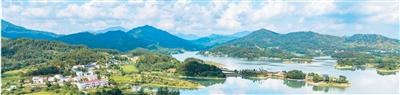 湖北省黄冈市团风县牛车河水库,蓝天白云下的水库碧波荡漾,绘就一幅乡村生态画卷。 王 江摄(人民视觉)