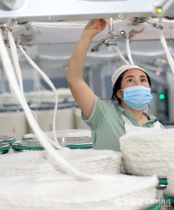 11月10日,喀什市长盛纺织科技有限公司工人在对接棉线。陈文军摄
