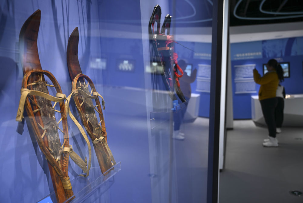 ↑2025年1月24日,游客在位于新疆将军山国际滑雪度假区的阿勒泰人类滑雪起源地博物馆参观。