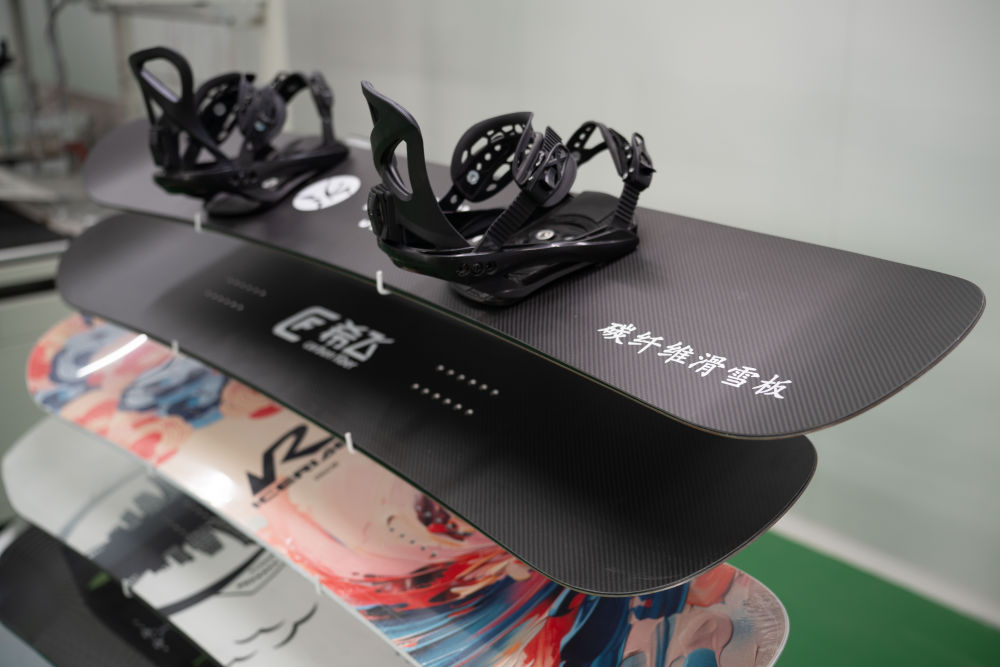 ↑2025年7月16日,在吉林化纤集团复材体育休闲装备产业园展出的碳纤维滑雪板。
