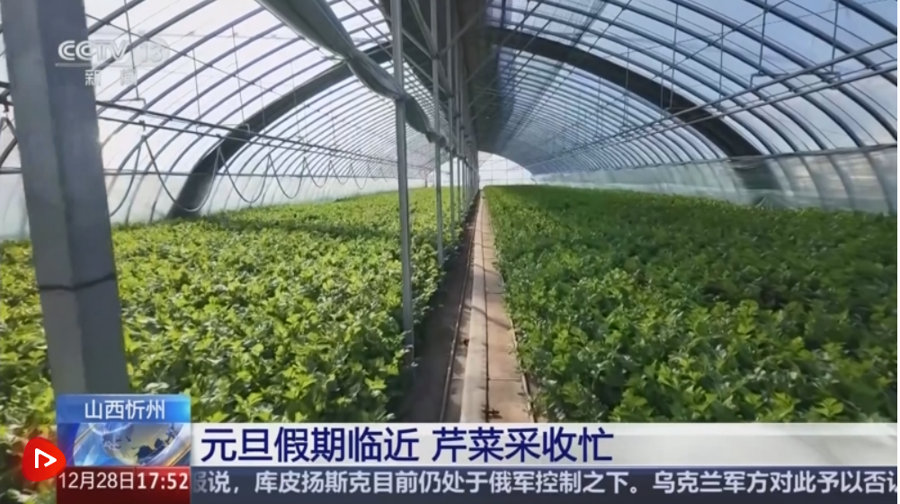 央视网消息:随着元旦假期即将到来,蔬菜市场迎来销售旺季,位于山西省忻州市高城村大棚温室内的芹菜也迎来收获期。