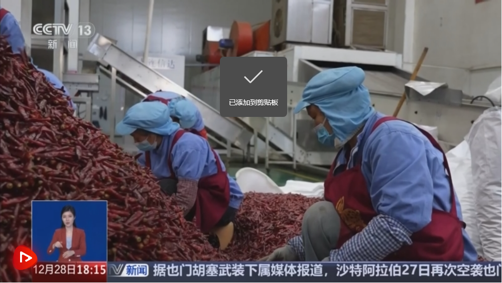 随着元旦临近,贵州遵义迎来了辣椒加工和销售旺季。田间地头,农民们忙着采摘火红的辣椒;生产车间里,机器轰鸣,工人们加班加点赶制特色辣椒产品,确保来自全国各地的订单能够及时运出。在遵义新蒲新区的一家辣椒企业的生产车间里,自动化生产线高速运转,工人们有条不紊地进行灌装、贴标、装箱等作业,经过标准化加工与严格质检,这些色泽诱人、香气扑鼻的辣椒制品将发往各地市场,登上千家万户的餐桌。目前,当地已形成“初加工—深加工—精加工”的三级体系,130多家加工企业年加工能力近30万吨,开发出190多种辣椒产品。