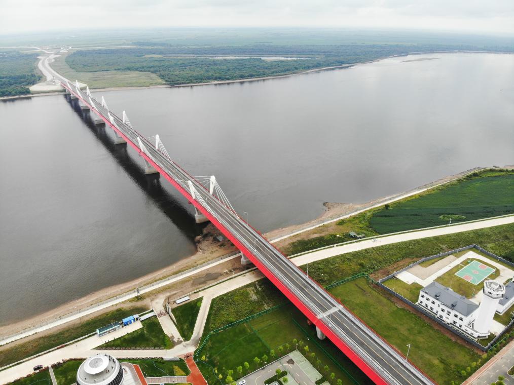 这是2023年8月11日在中国黑河一侧拍摄的黑河-布拉戈维申斯克公路桥(无人机照片)。新华社记者王松摄