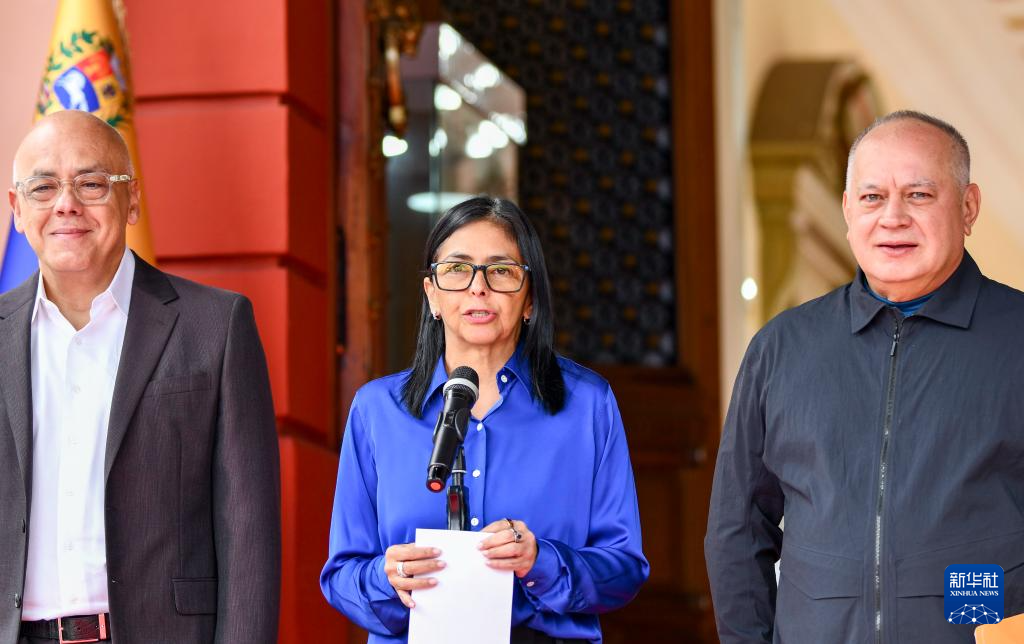 1月14日,在委内瑞拉首都加拉加斯的总统府观花宫,委内瑞拉代总统德尔西·罗德里格斯(中)、全国代表大会主席豪尔赫·罗德里格斯(左)和内政部长卡韦略共同参加新闻发布会。新华社记者 丁洪法 摄