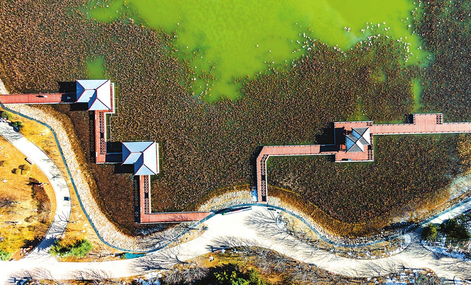 1月12日,俯瞰曲沃县晋园景区如意湖,褐色残荷与青绿湖水交织,氤氲着浓浓诗意,木质栈道与中式廊亭嵌入湖间,尽显古朴雅韵。(张跟慧摄)