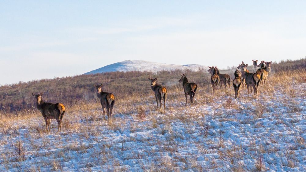 鹿群行走在山间,与白雪相映成趣