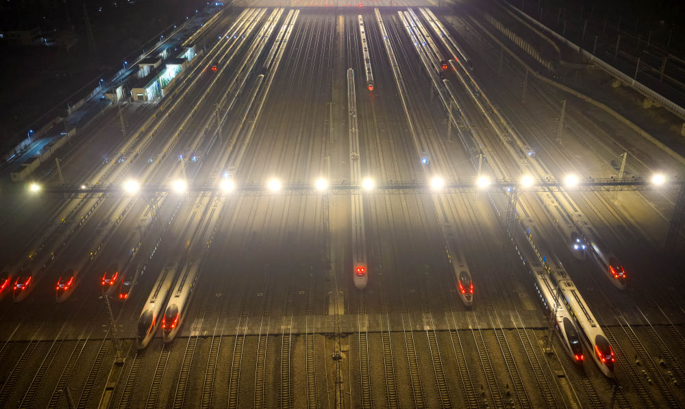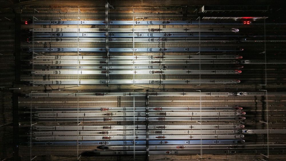 ↑ 这是1月25日凌晨在昆明车辆段昆明南动车运用所拍摄的动车组列车(无人机照片)。新华社发(杨紫轩摄)