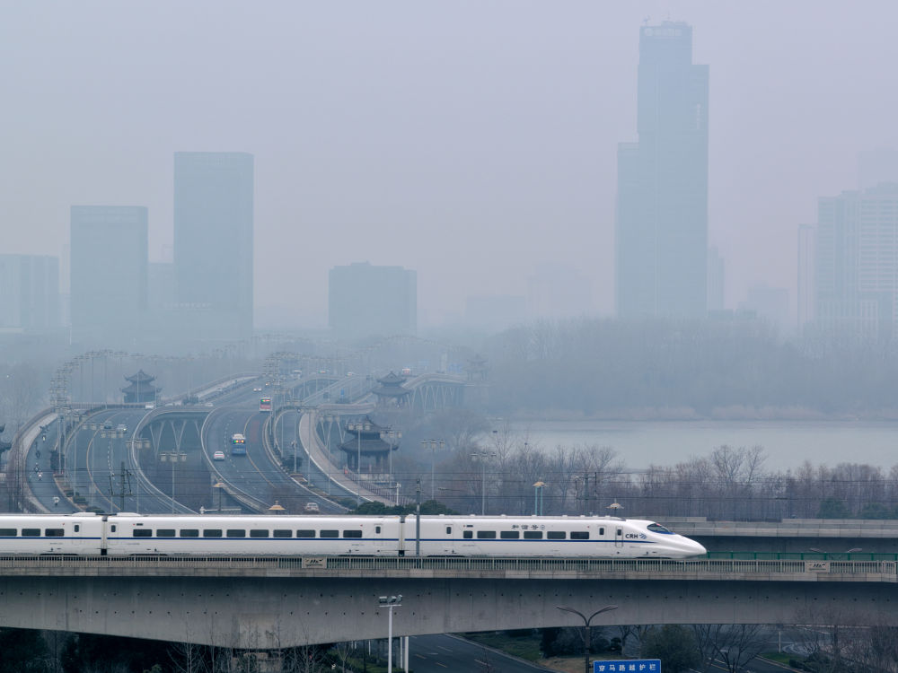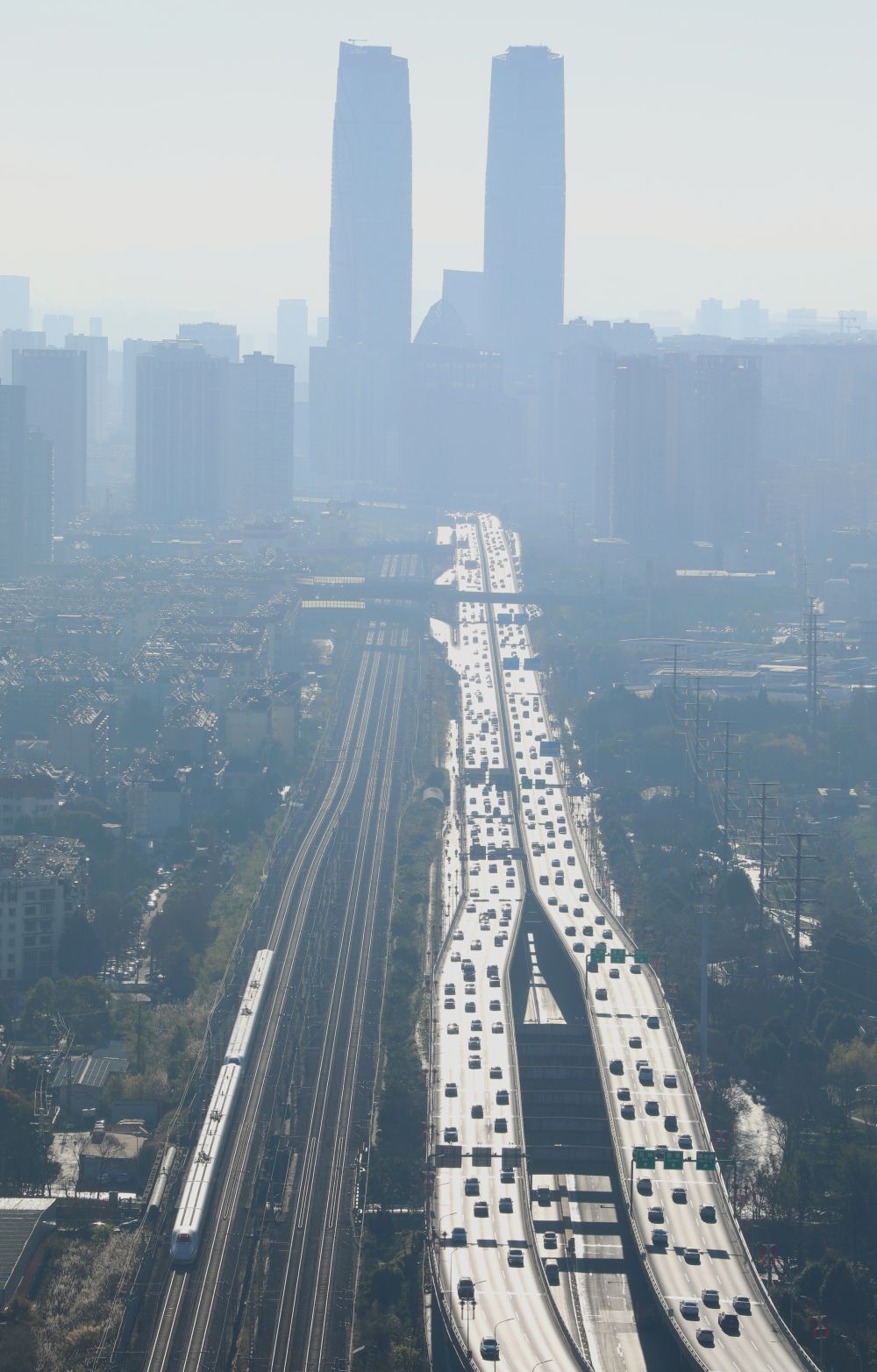 ↑ 1月25日,动车组列车穿行于云南昆明城区。新华社发(郑益 摄)