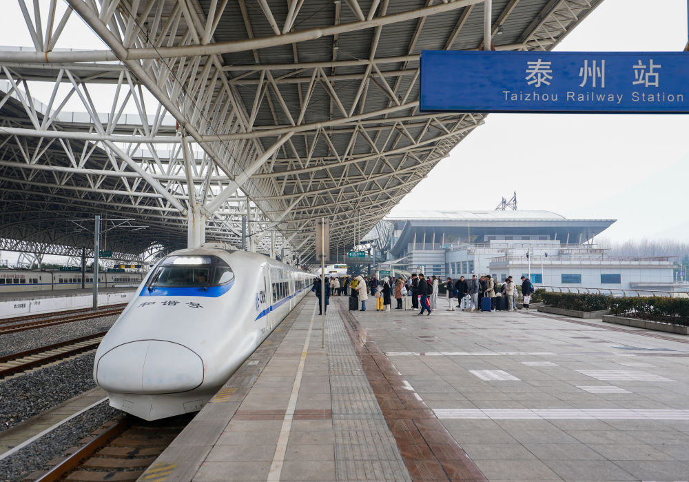 ↑ 1月25日,旅客在江苏泰州站站台准备乘车出行。新华社发(周社根 摄)