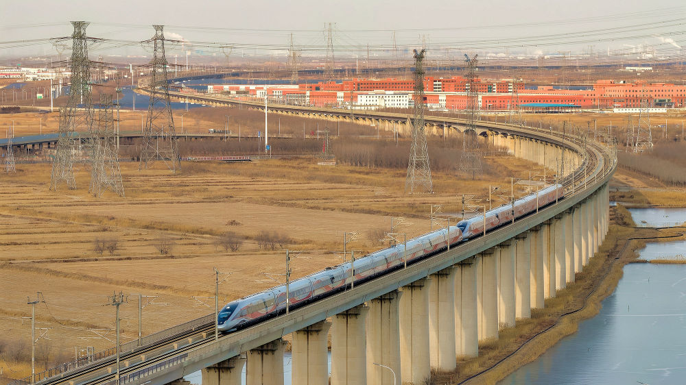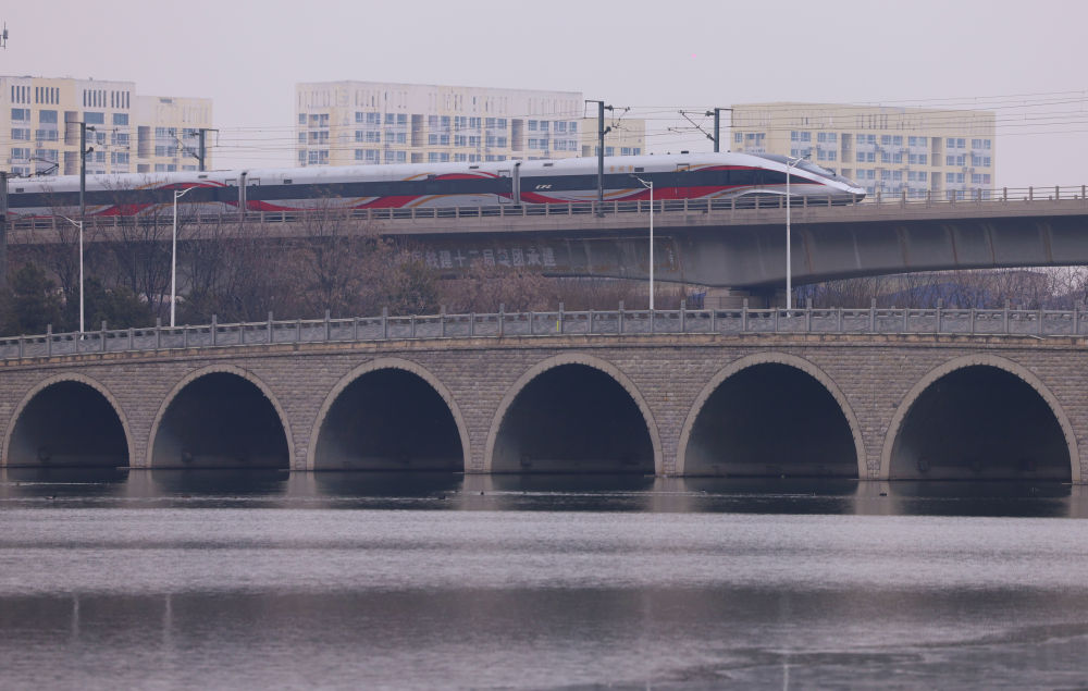 ↑ 1月25日,动车组列车行驶在天津市境内(无人机照片)。新华社发(杜鹏辉 摄)