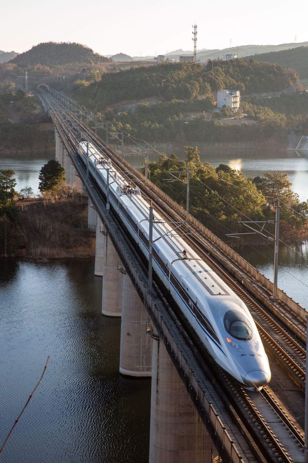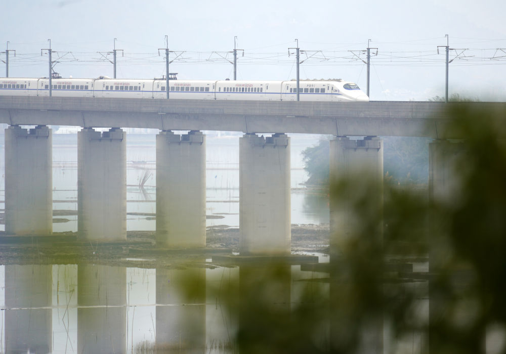 ↑ 1月25日,动车组列车从云南省曲靖市马龙区旧县街道车马碧水库上驶过。新华社发(杨俊鹏 摄)