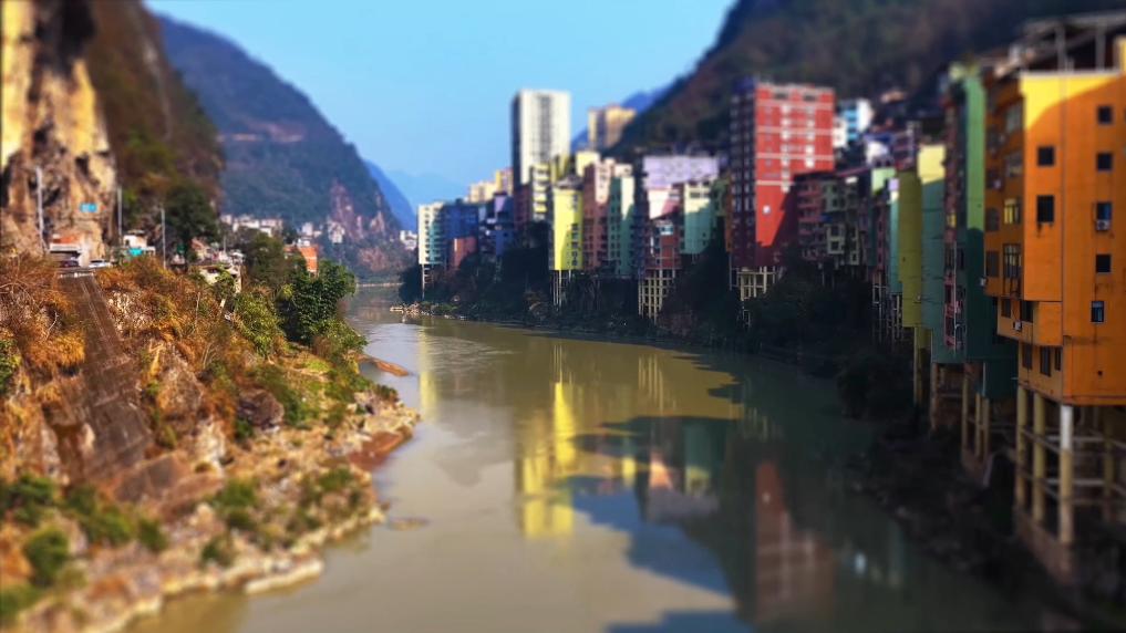 二月暖阳下,云南省昭通市盐津县城仿佛漫画世界。移轴视角里,浅浅的蓝、淡淡的粉……更加迷离生动,装点着沿河吊脚楼。