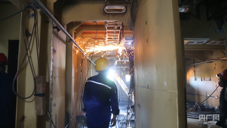 “宁远电鲲”号造船现场,工人正在进行焊接作业 (央广网见习记者 尹博 摄)