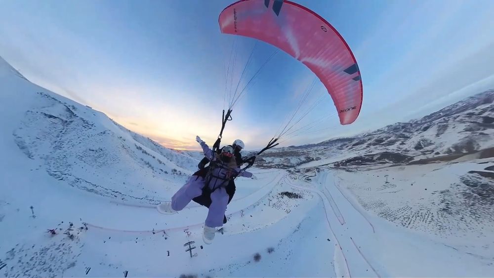 如今,新疆各大雪场早已不是单一的滑雪场地,而是成为融合运动、观光、文化和休闲的综合性度假目的地。在阿勒泰将军山国际滑雪度假区,滑翔伞划过雪道上空,热气球缓缓飘浮在雪场之上,与连绵的雪山相映成趣。