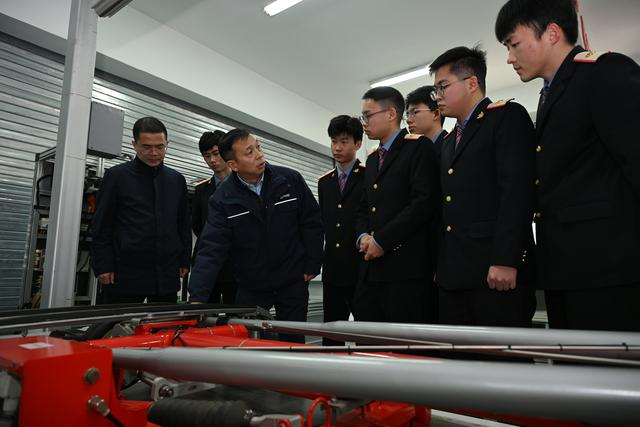 2月4日,在位于陕西省渭南市的陕西铁路工程职业技术学院实训室,董宏涛(左三)与师生交流。新华社记者 李一博 摄