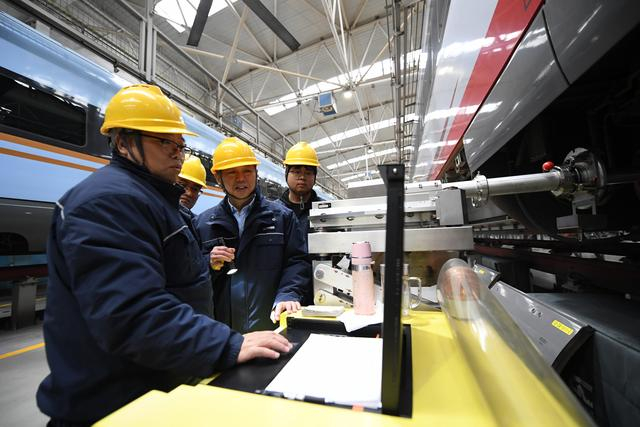 1月14日,在位于中国铁路西安局集团有限公司西安动车段的动车组检修库,董宏涛(右)和青年职工一起检修动车组列车。新华社记者 李一博 摄