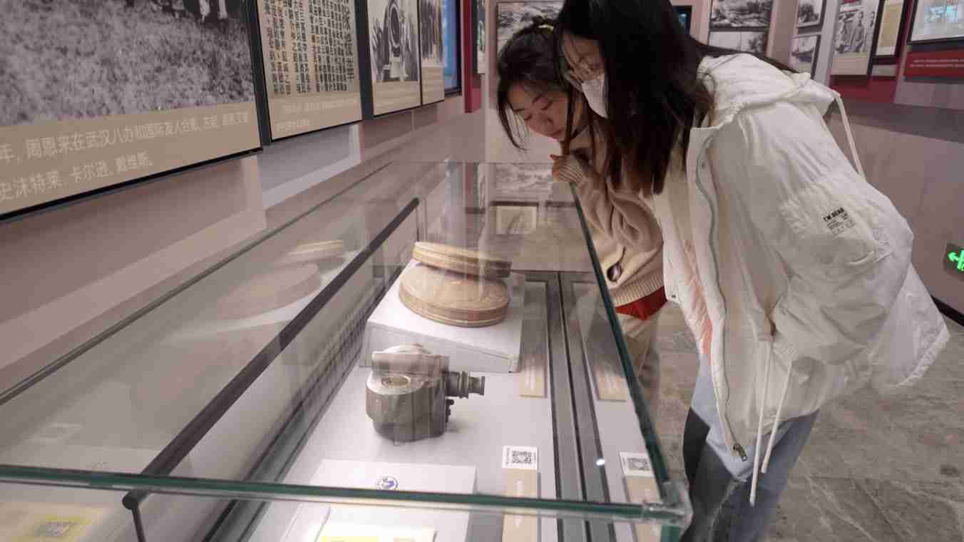 3月1日,“青春华章·行走的大思政课——2026全国大学生社会实践团湖北江苏行”活动走进武汉大学,来自湖北江苏两省10所高校的12名大学生,在珞珈山周恩来旧居展厅的一张照片前驻足。讲解员介绍,照片中周恩来、邓颖超身边由三脚架支起的摄影机,正是1938年著名荷兰电影导演尤里斯·伊文思送给延安八路军的电影摄影机。