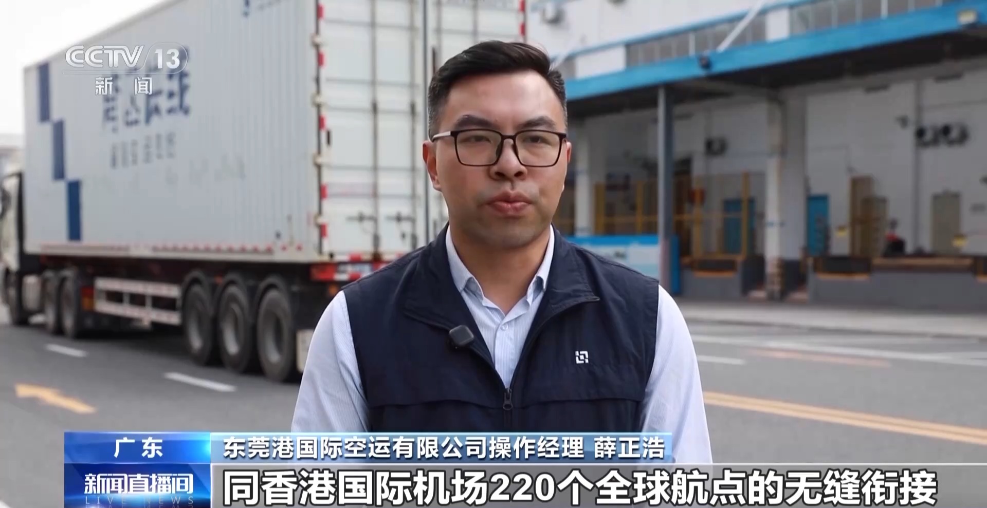 东莞港国际空运有限公司操作经理 薛正浩:空港中心已实现同香港国际机场220个全球航点的无缝衔接,出口货物从抵达空港中心到登上香港机场航班起飞,全程已稳定压缩至14小时以内,大幅提升“湾区制造”出海效率。