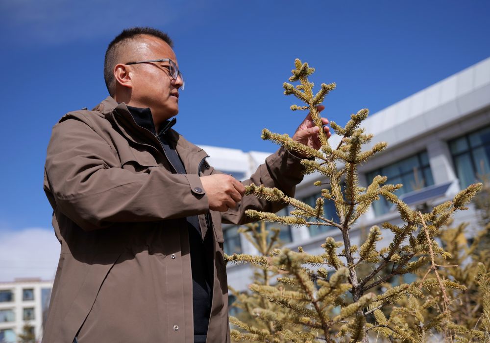 3月20日上午10点30分,扎西像往常一样来到市科技局的院子里,仔细查看树木的长势。他弯腰伸手,摸了摸树的叶子和枝条,又踩了踩树下的土壤。“越冬情况总体稳定,也有了返青迹象,可以开始浇水、施肥了。”扎西欣喜地说。