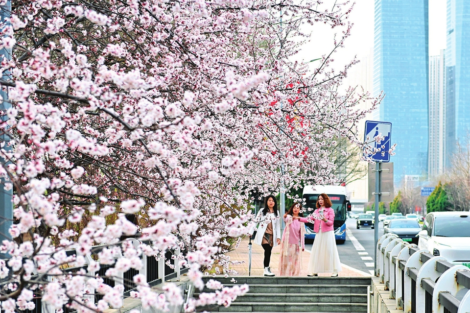 3月26日,山西博物院东门地下通道旁,杏花进入盛花期,粉白花朵缀满枝头,市民驻足赏花,感受春日生机。(记者 范文静摄)