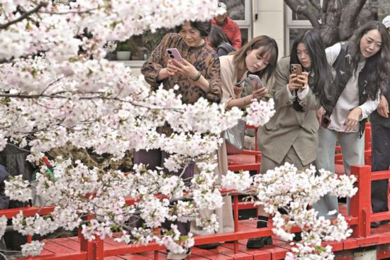 3月30日,嘉兴市区樱花谷智汇产业园内樱花盛放,引得市民、游客纷纷驻足拿起手机拍照留念,在繁花似锦的春光中定格美好。(王嘉宁)