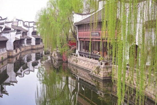 3月30日,在嘉兴市区月河历史街区,河道旁柳树抽出嫩绿的新芽,别有一番韵味,市民漫步在青石板上,感受生机勃勃的江南老街春日景象。(张启帆)