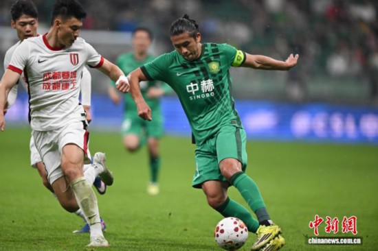 4月12日,在北京工人体育场进行的2026赛季中国足球协会超级联赛第五轮的比赛中,北京国安队主场1比2不敌成都蓉城队。图为北京国安队球员张玉宁(右)在比赛带球突破。 中新社记者 田雨昊 摄