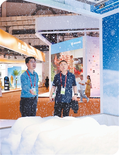 往前走,一股凉意扑面。在华发集团展位,只见一座迷你冰雪世界——玻璃罩内,造雪机嗡嗡作响;伸出手,水汽凝结的冰晶落在掌心,丝丝凉意透入皮肤。