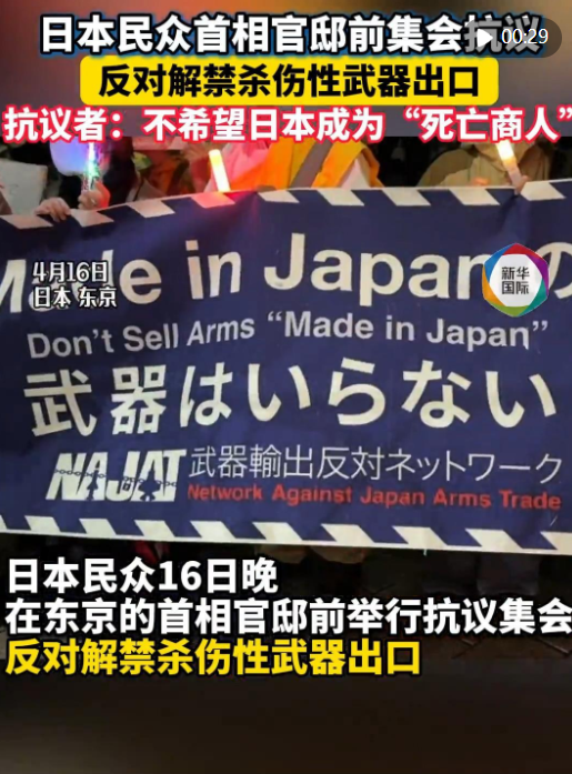针对高市早苗政府计划近期修改“防卫装备转移三原则”及其运用指南,日本民众16日晚在东京的首相官邸前举行抗议集会,反对解禁杀伤性武器出口。
