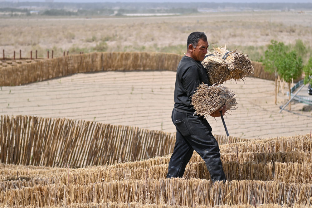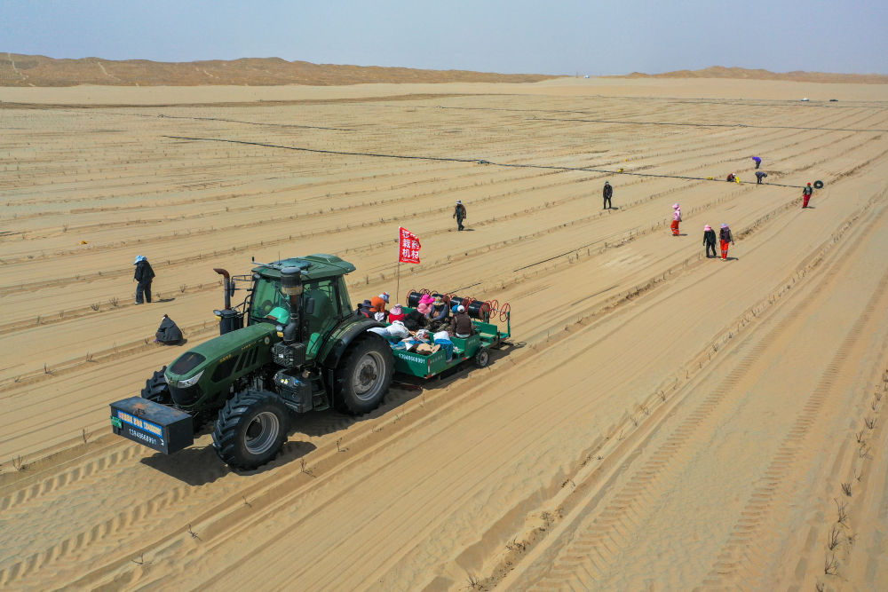 眼下,新疆塔克拉玛干沙漠南缘一派繁忙景象。人们平整沙丘、铺设草方格、嫁接苗木、栽种中药材……塔克拉玛干沙漠边缘治沙正酣。