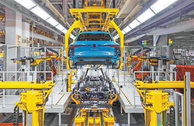 大众安徽整车制造基地生产车间内的电动汽车自动化生产线。 大众汽车供图 |