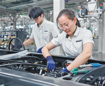 斯堪尼亚江苏如皋工业生产基地内,技术人员正在紧张作业。 斯堪尼亚供图 |