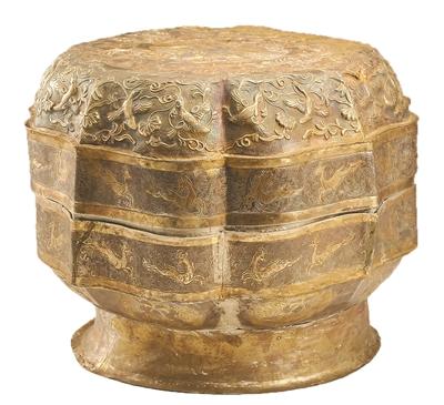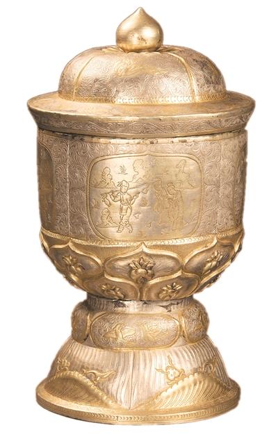 法门寺是唐代皇家寺院,其地宫中出土的成套鎏金银茶具、香具等精美绝伦,价值非凡。香宝子是专门用来盛放香料的容器,常与香炉配套使用,多供于佛像前香案之上。法门寺地宫共出土了两件鎏金人物画银香宝子,大小、形制相同,腹壁各錾刻4幅不同的人物画,刻画精细,故事性十足。此次展出的这件香宝子,腹壁绘图推测为菩提悟道、仙人对弈、四门游观等故事图,其盖面饰飞狮等瑞兽,底座上部饰凤凰、鸿雁、鸳鸯、鹦鹉等珍禽。