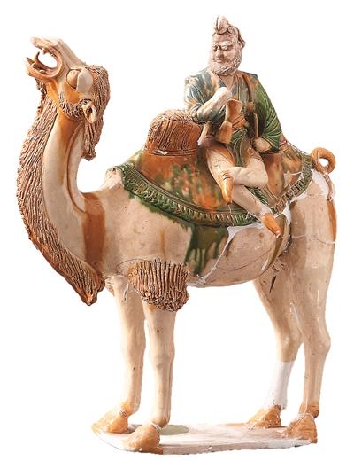 盛唐时期,许多外国人定居中国境内,不少人落户长安。他们从事各种职业,其中一些人甚至在朝廷中担任要职。唐代墓葬陶俑中经常出现外国人的形象,是这一时期社会风貌的真实写照。三彩胡人骑驼奏乐俑出土于西安市长安区。骑在骆驼上的胡人乐师鼻梁高耸,胡须浓密,身穿长袖翻领长袍,足蹬尖头鞋,侧身而坐,双手各持一支鼓槌,胸前系着一面鼓,仿佛随时准备击鼓伴奏、高歌一曲。骆驼头部高扬,张口嘶鸣,似与乐师和鸣。这件充满动感的文物,生动塑造了胡人乐师的形象,印证了丝路文化交流。