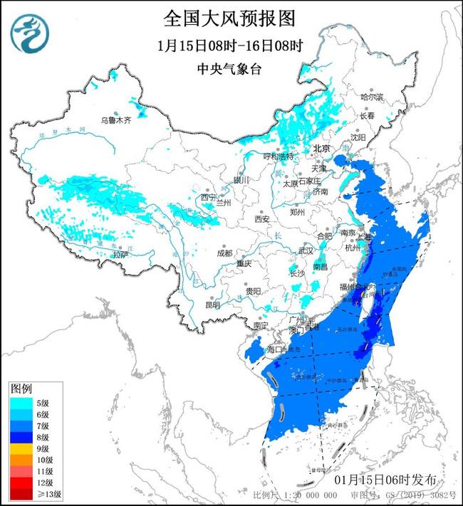 预计,1月15日08时至16日08时,西藏中部和北部、青海南部、新疆山口地区、内蒙古中东部、河北北部、北京西部、辽东半岛、山东半岛、江苏沿海、浙江沿海等地部分地区将有5~6级、阵风7~8级的大风;渤海、渤海海峡、黄海大部海域、东海大部海域、台湾海峡、台湾以东洋面、巴士海峡、南海大部海域、北部湾将有7~8级、阵风9级的大风,其中台湾海峡部分海域风力可达9级、阵风10级。