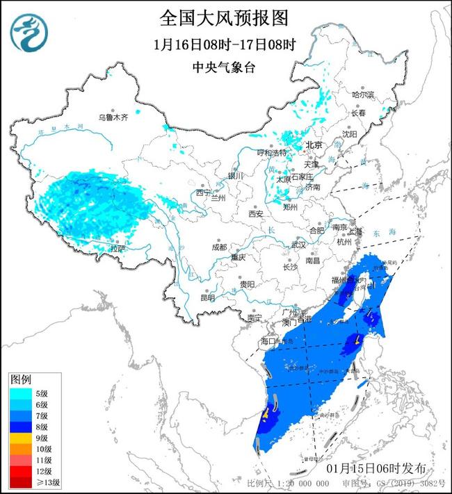1月16日08时至17日08时,西藏中西部、青海西南部等地将有5~7级、阵风8~9级的大风,内蒙古中东部、河北北部等地部分地区将有4~6级、阵风7级的大风;东海南部海域、台湾海峡、台湾以东洋面、巴士海峡、南海大部海域将有7~8级、阵风9级的大风,其中南海东北部和西南部的部分海域风力可达9级、阵风10级。