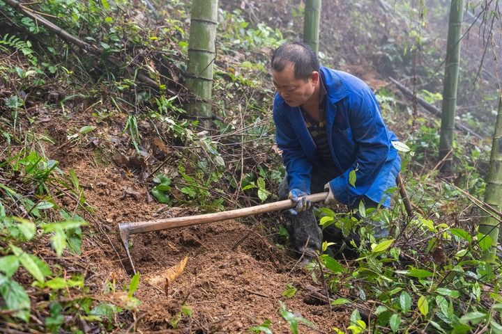 2024年12月10日,在永州市双牌县何家洞镇笋材两用林培育基地,村民在挖竹笋。新华社记者陈思汗摄