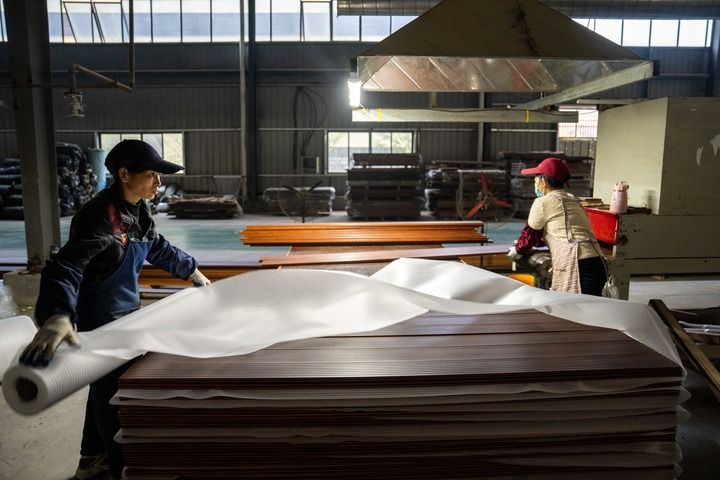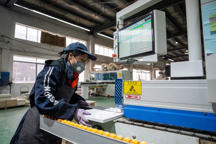 2024年12月9日,在位于永州市双牌县竹木产业智能科技园的湖南叁一科技有限公司竹木制品生产车间,工人在加工板材。新华每日电讯记者陈思汗摄