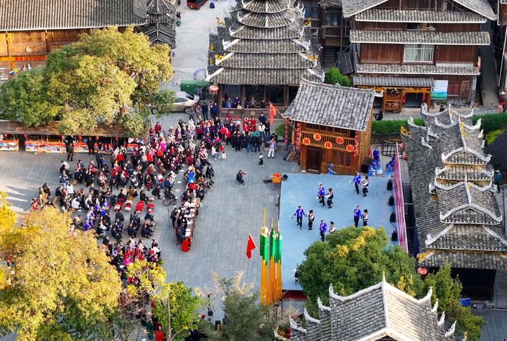游客在通道侗族自治县皇都侗文化村观看民俗表演。李尚引 摄